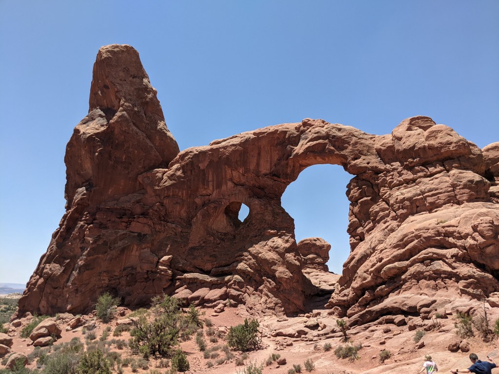 The reward at the end of this trail is fantastic views of the arch, with the tradeoff that you will get buffeted by 30 mph gusts of wind. It is intense. At the top, children burrowed into their parents’ chests, trying to avoid the sand blasting their faces. The rest of us staggered around trying not to get blown off the cliff as we posed for pictures.