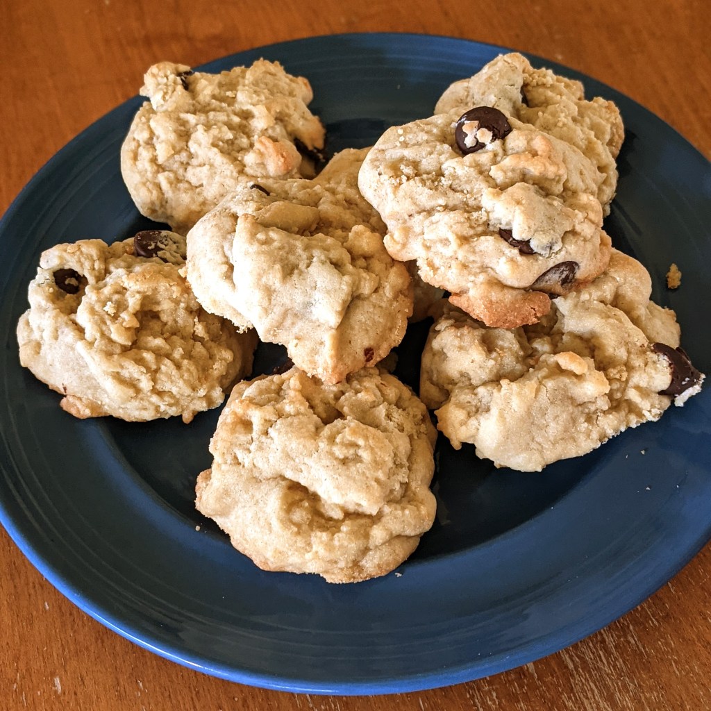 I’ve been making these cookies for years, so I don’t remember exactly when I first tried this experiment. But I was following a recipe for “best chocolate chip cookies” I’d found on allrecipes.com, and when it came time to measure out the sugar, I was like, Dang that’s a lot of sugar. I just couldn’t do it. I decided to try cutting the amount of white sugar and brown sugar in half. The cookies turned out cakey and fluffy, super soft in the center but nicely snappy on the outside. With less sugar in the recipe, the cookies do not spread and carmelize as much as others I’ve made.
