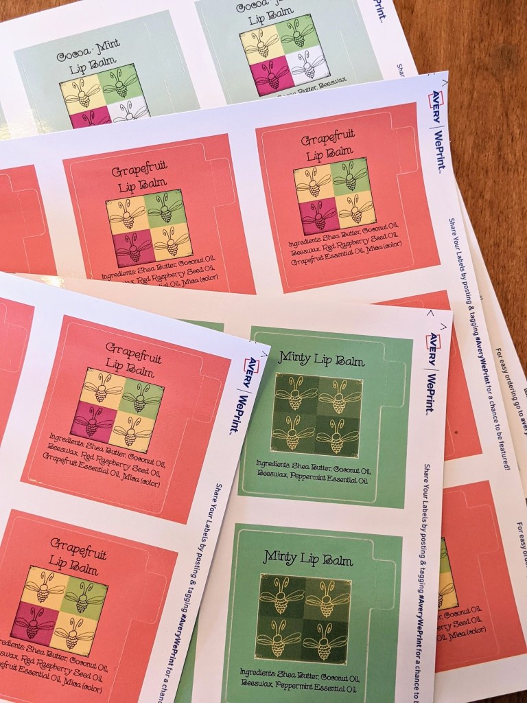 At the Avery online store, you can find a template expressly for 2 1/8” x 2 1/8” “Lip Balm Labels.” Create your custom design, order sheets of labels (12 per sheet), apply them to the tubes, and voila. Your results will look next-level professional, so don’t be surprised if people are shocked when they learn that you made the lip balm yourself!