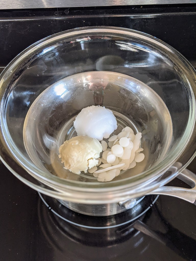 Add the ingredients to a double-boiler and gently heat until melted. (Some people use a microwave; I prefer being able to monitor the slow melting on the stovetop.) I don’t have a fancy double-boiler—I just use a glass bowl resting on top of a pan of simmering water.