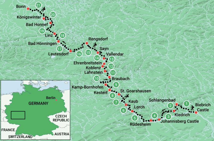 We chose to hike part of Germany’s Rheinsteig, a 320-km (200-mile) trail along the eastern banks of the Rhine River from Bonn to Wiesbaden. Germans love to hike, and the Rheinsteig is billed as one of Germany’s top trails. The trail is divided into 21 stages, which people explore in all different combinations of through-hikes and day-hikes.